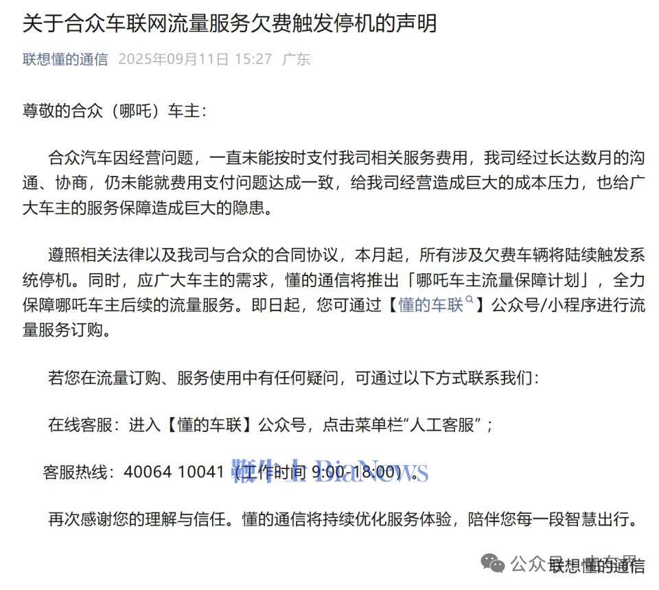 事件发生后,哪吒汽车发短信提醒全体车主: 因“联想懂的”单方面拒绝履行与哪吒汽车达成的 《车 联网服务协议》,联想懂的将陆续停止对哪吒汽车的车联网流量服务。如哪吒汽车已无法联网,可到联想懂的微信公众号自助购买流量,或致电联想懂的客服电话。