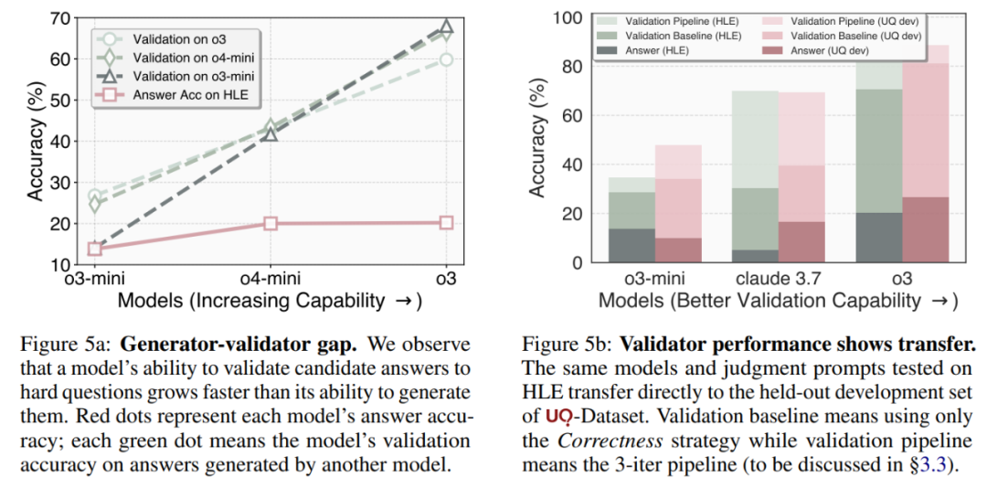 图 5 左显示:随着模型能力的提升,它们在验证准确率上的进步速度明显快于答题准确率。