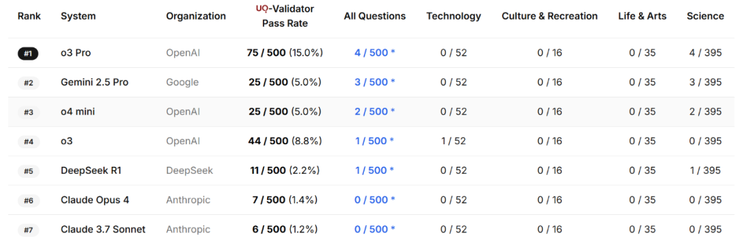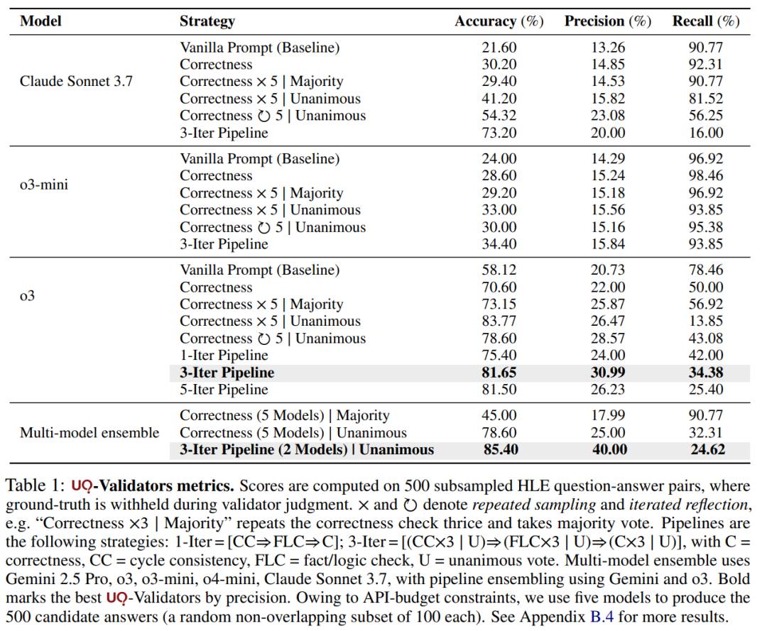 实验中,表现最好的模型仅在 15% 的问题上通过了 UQ 验证,而初步人工核查已经在这些通过验证的答案中识别出一些正确解答。