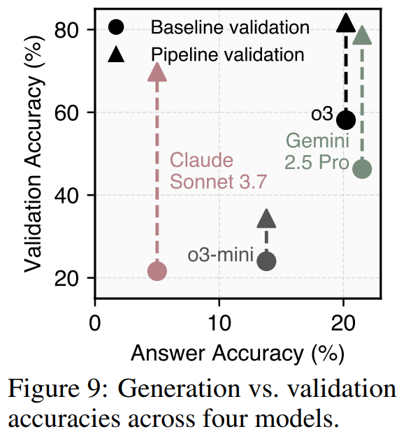 本文通过基线提示法和 3 轮迭代验证流程绘制了模型在 500 个 HLE 问题上的验证准确率与答案准确率关系图。虽然更好的答案性能通常预示着更好的验证性能(整体呈上升趋势),但并非绝对。