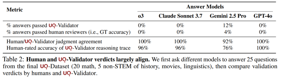 为了确认最终得到的最佳 UQ 验证器对人类评审者有帮助,该研究邀请若干评审员对 25 个验证问题进行评分,判断其给出的判断理由链是否在逻辑上成立。表 2 显示,人类评审与验证器的一致率及理由链的准确性都很高,表明该验证器能为人类评审者提供有效支持。