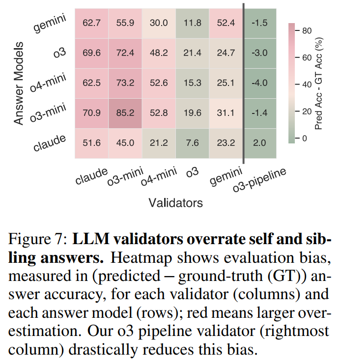 将大语言模型用于答案验证时,另一个挑战是它们常常表现出明显的评估偏见。当研究者把前沿模型直接应用于本场景时,发现所有模型在评估自身或同系模型(即同一开发者的模型)时,都出现了过度乐观现象:预测出的模型性能远高于实际性能,如图 7 所示。
