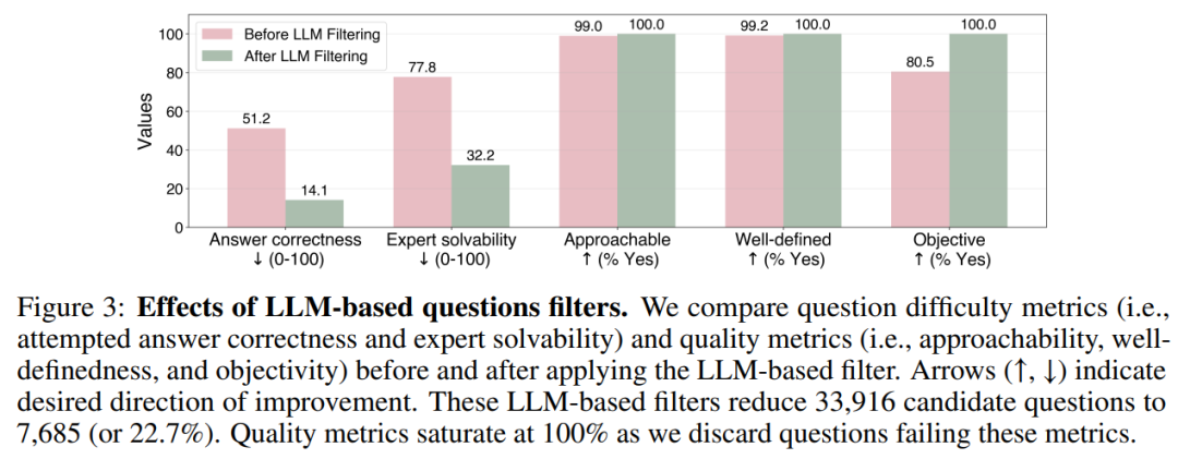 随着问题在筛选流程中逐步推进,它们的难度和质量也在逐渐提升。尤其是基于大语言模型的筛选,显著提高了问题的难度。