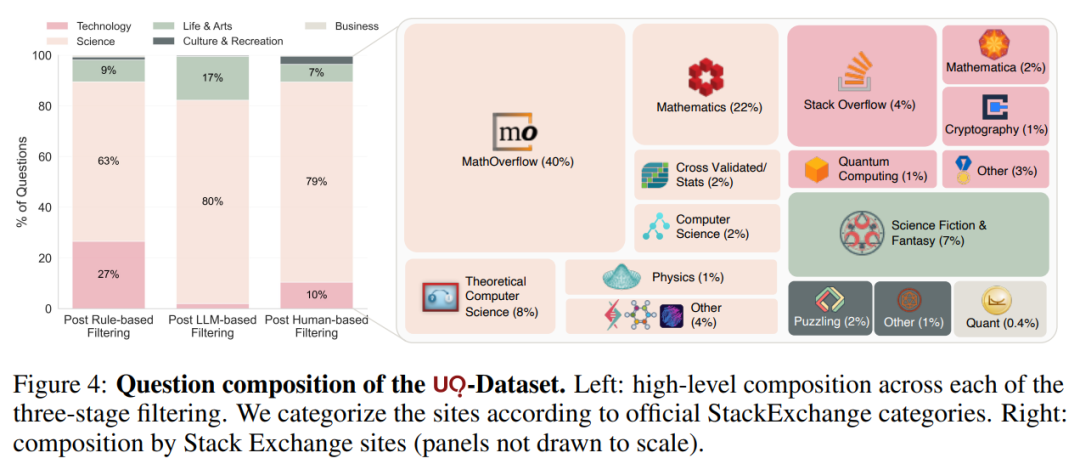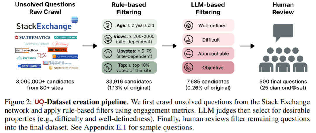 在筛选流程上,本文首先人工选择了 80 个 Stack Exchange 社区(例如 Math Overflow、Physics),并抓取其中未解答的问题,得到大约 300 万个原始候选问题。