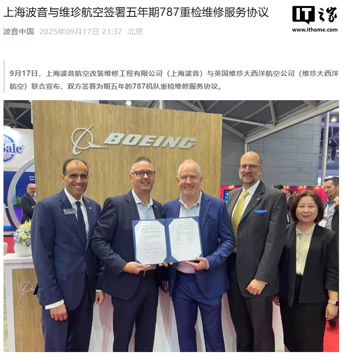 IT之家 9 月 18 日消息,9 月 17 日,上海波音航空改装维修工程有限公司(上海波音)与英国维珍大西洋航空公司(维珍大西洋航空)联合宣布,双方签署为期五年的 787 机队重检维修服务协议。