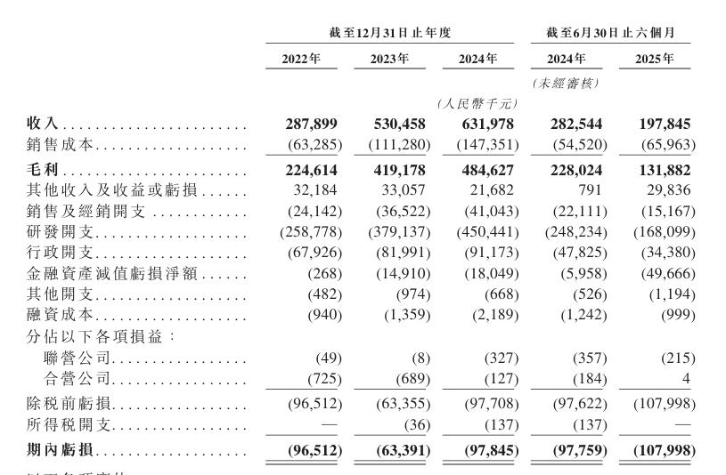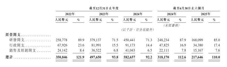 迅策科技公布的招股书披露,2022年至2024年,公司营收分别为2.88亿元、5.30亿元和6.32亿元;同期毛利分别为2.25亿元、4.19亿元和4.85亿元。然而,其在上述三年均录得期内亏损,分别达到9651万元、6339万元和9785万元。 2025年上半年,迅策科技实现营收1.98亿元,较上年同期的2.83亿元下降约30%;毛利为1.32亿元,也低于上年同期的2.28亿元。此外,期内亏损进一步扩大至1.08亿元,净亏损率达54.6%,上年同期亏损为9776万元。 据招股书披露,迅策科技近年产生的亏损,与其在研发、行政及销售分销等方面的高额开支密切相关。 迅策科技明确表示:“我们的净亏损主要归因于业务迅速扩张而产生的大量研发开支、行政开支以及经销开支。”