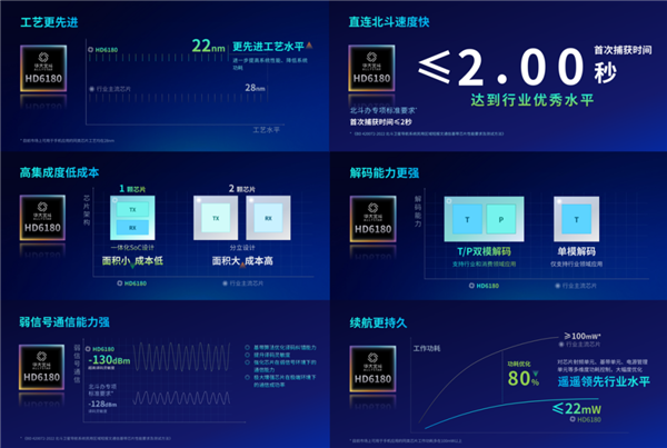 架构上,HD6180采用设计难度更大的RDSS射频收发一体化高集成度架构,在一颗芯片上实现了射频收发的双向功能,简化芯片外围电路的复杂度,使芯片面积和成本得到进一步优化,