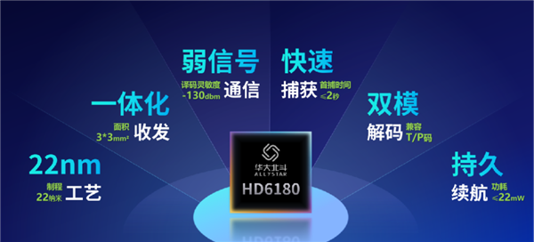 据介绍,HD6180通过基带算法优化了译码纠错能力,提升译码灵敏度,达到-130dBm,超过北斗办专项标准要求的-128dBm,强化芯片在弱信号环境下的通信能力,极大增强芯片在极端环境下的通信成功率。