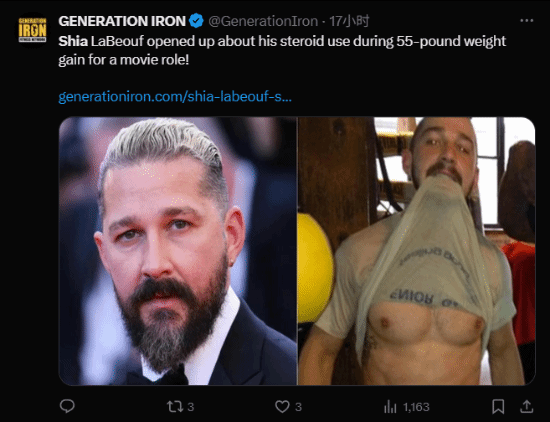 据媒体报道,近日,《变形金刚》男主角希亚·拉博夫公开承认曾使用类固醇药物辅助增肌,引发关注。