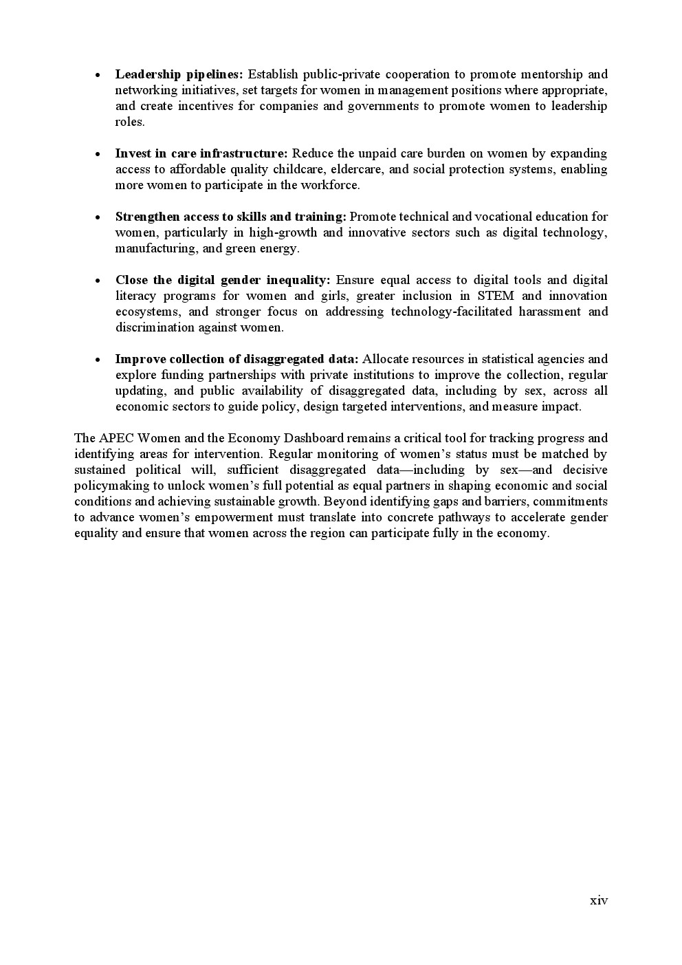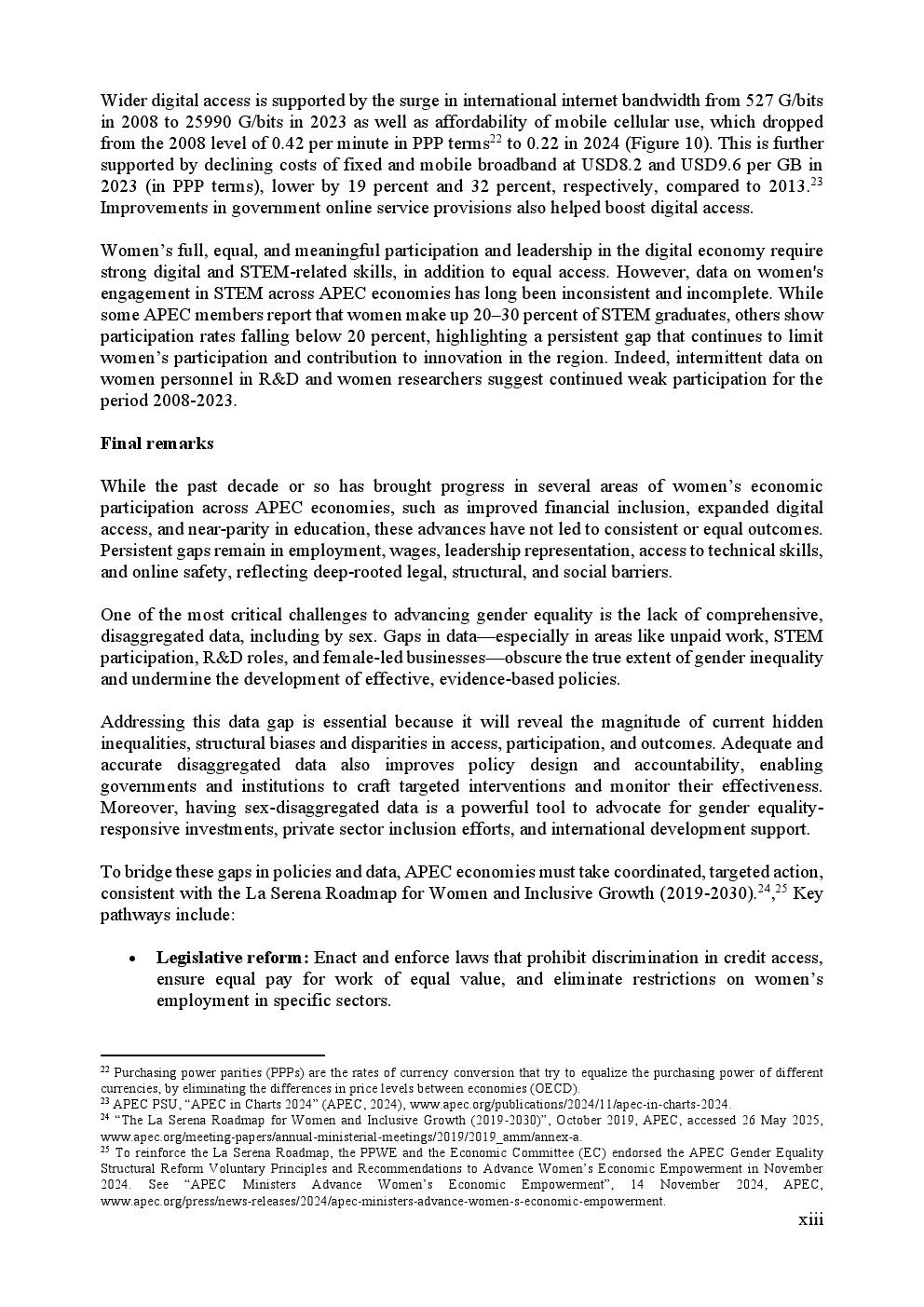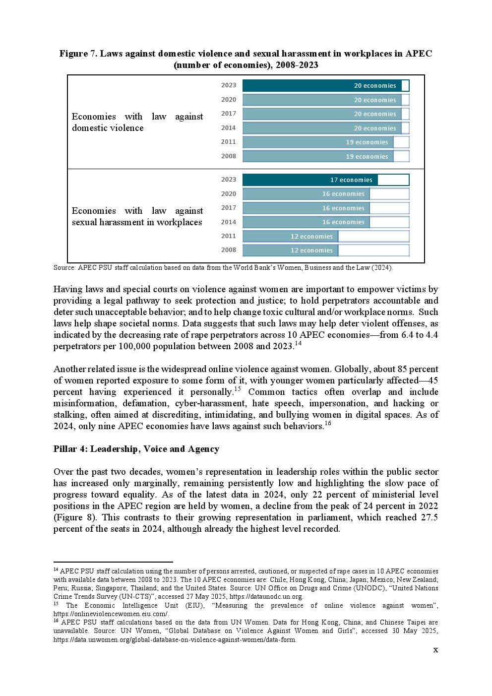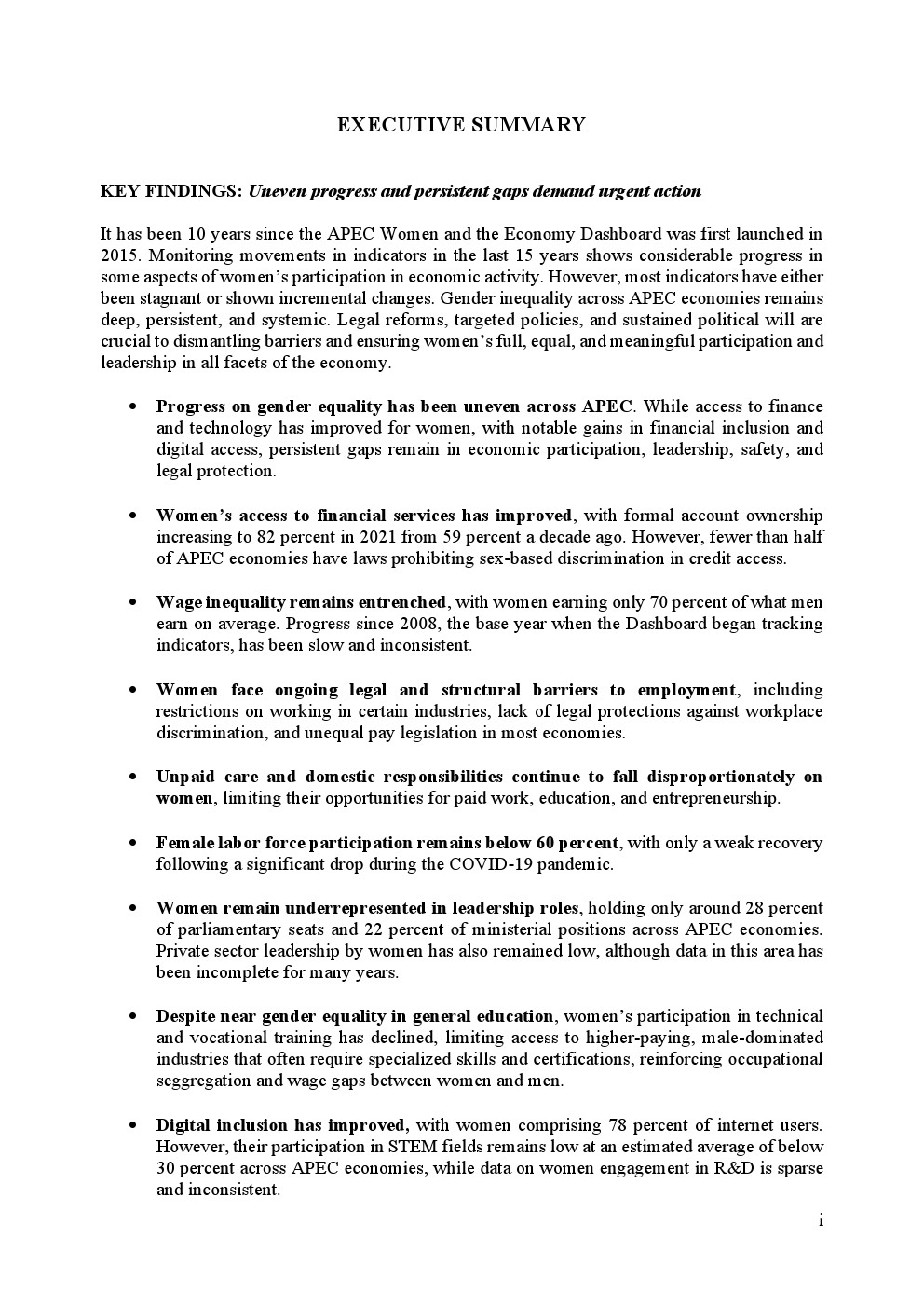 • APEC范围内的性别平等进展不均衡。虽然妇女获得资金和技术的机会有所改善,在金融包容性和数字接入方面取得显著进展,但在经济参与、领导力、安全和法律保护方面仍然存在持续差距。