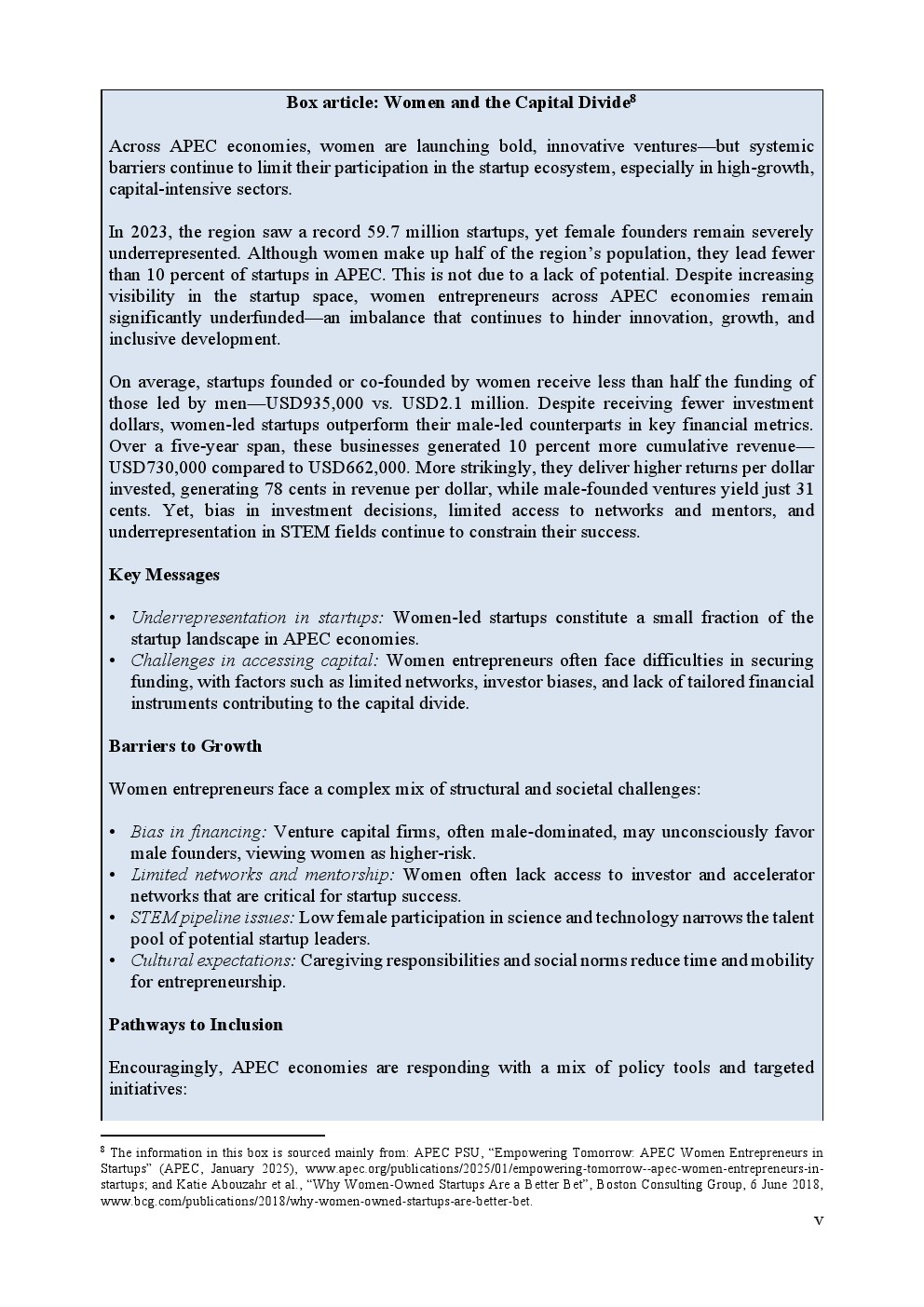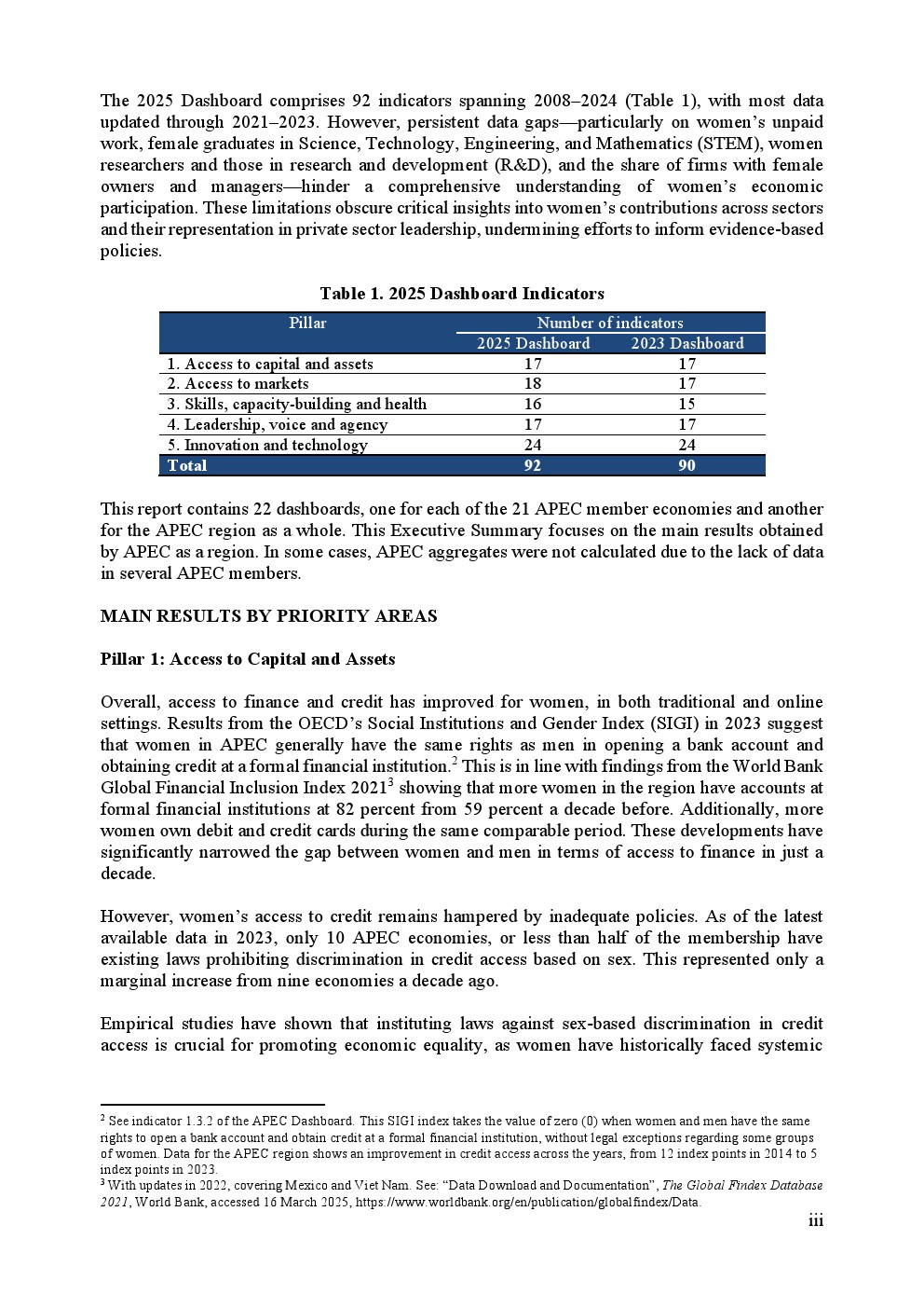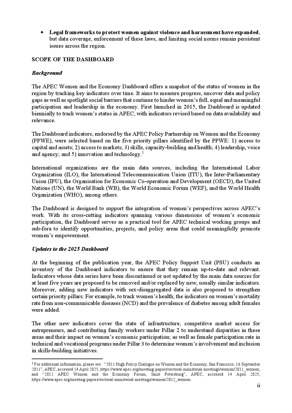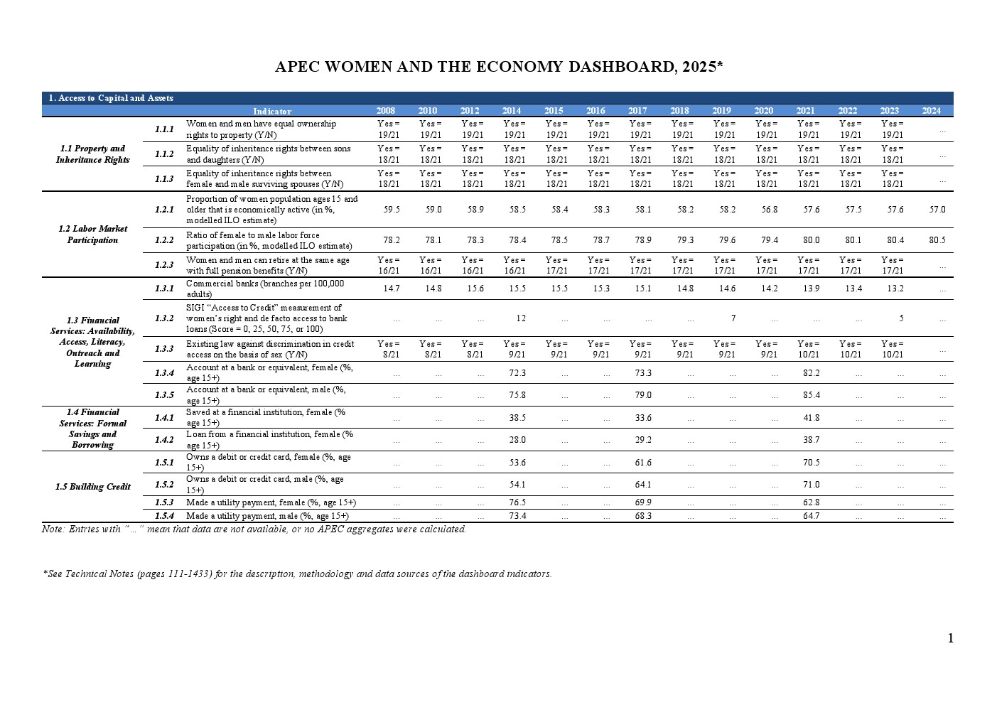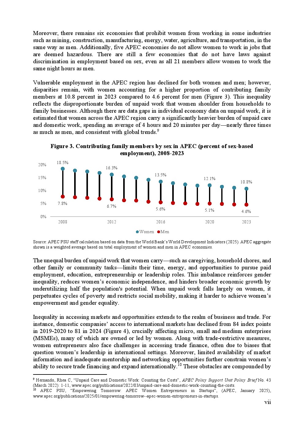 • APEC范围内的性别平等进展不均衡。虽然妇女获得资金和技术的机会有所改善,在金融包容性和数字接入方面取得显著进展,但在经济参与、领导力、安全和法律保护方面仍然存在持续差距。