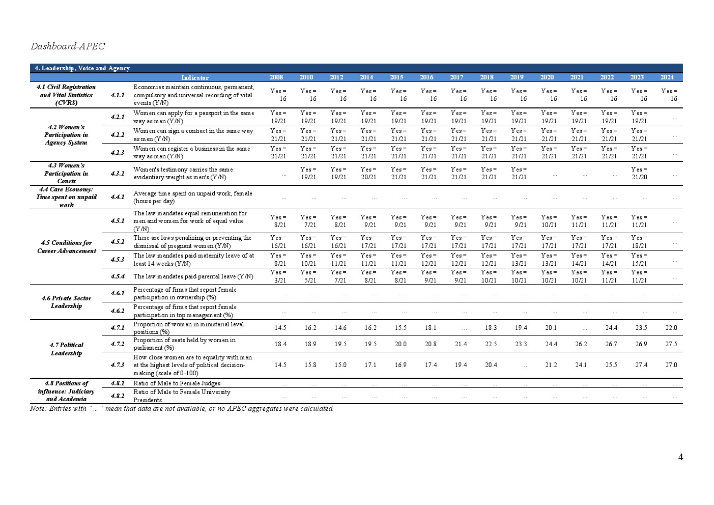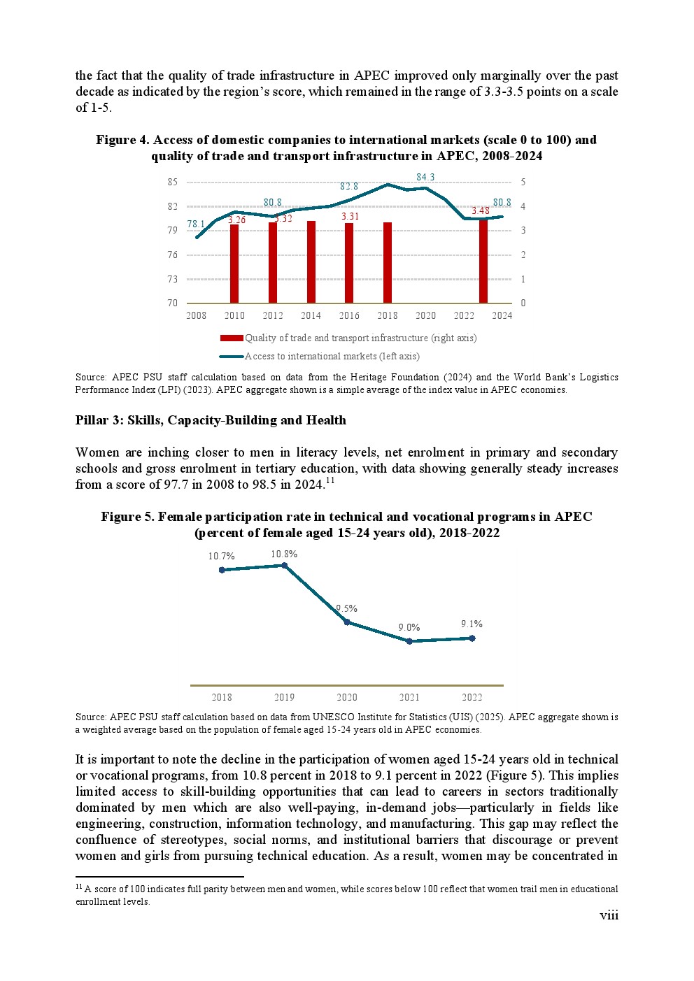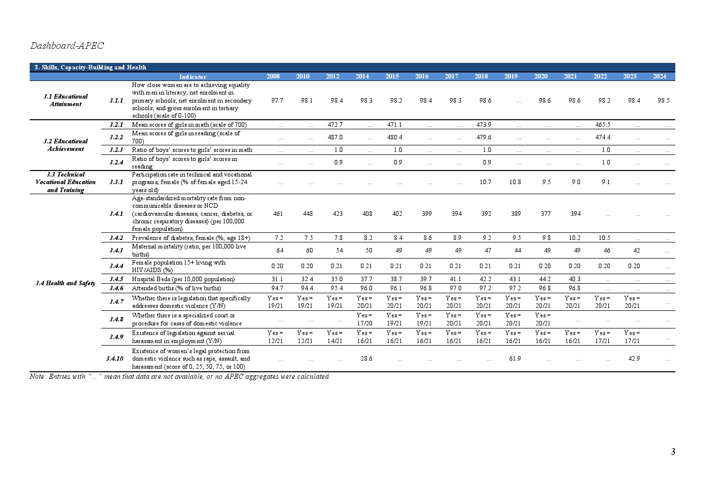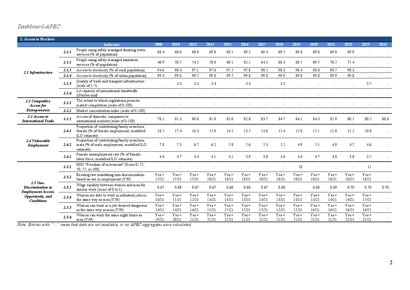 • APEC范围内的性别平等进展不均衡。虽然妇女获得资金和技术的机会有所改善,在金融包容性和数字接入方面取得显著进展,但在经济参与、领导力、安全和法律保护方面仍然存在持续差距。