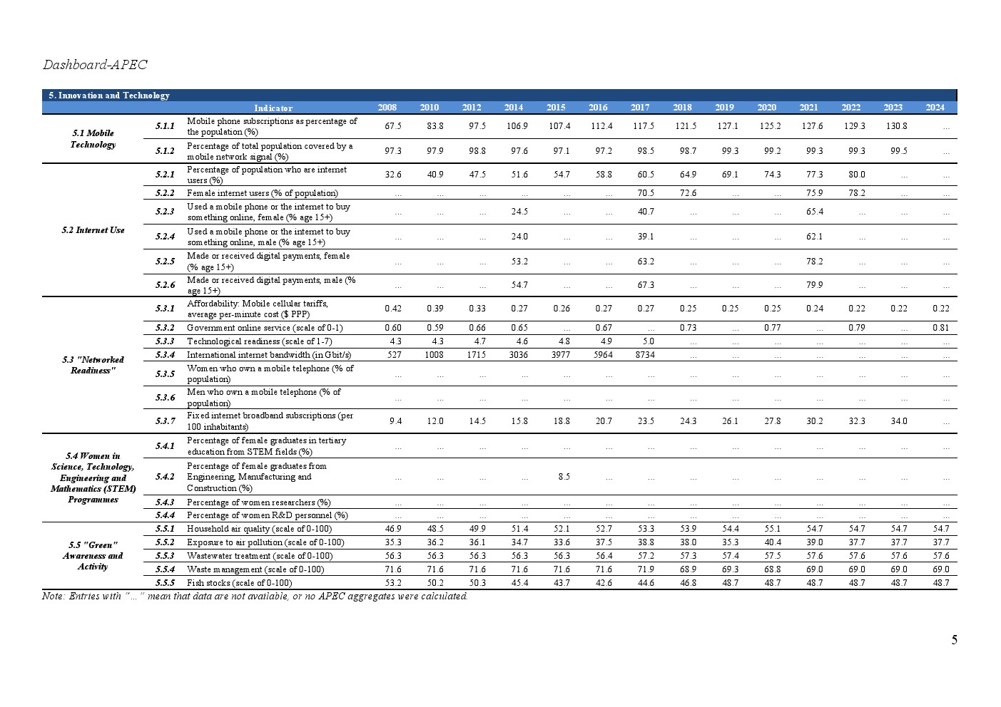 • 数字包容性有所改善,妇女占互联网用户的78%。她们在STEM行业的参与度仍然较低,APEC经济体的平均估计低于30%,而关于妇女参与研发的数据稀疏且不一致。