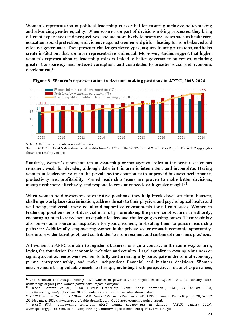 • 妇女在领导职位中的代表性仍然不足,在APEC经济体中仅占据约28%的议会席位和22%的部长职位。尽管该行业数据多年来不完整,但私营部门女性领导力也一直处于较低水平。