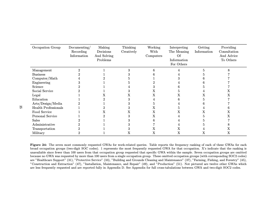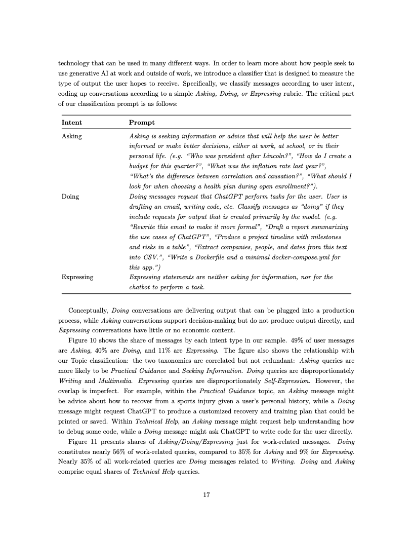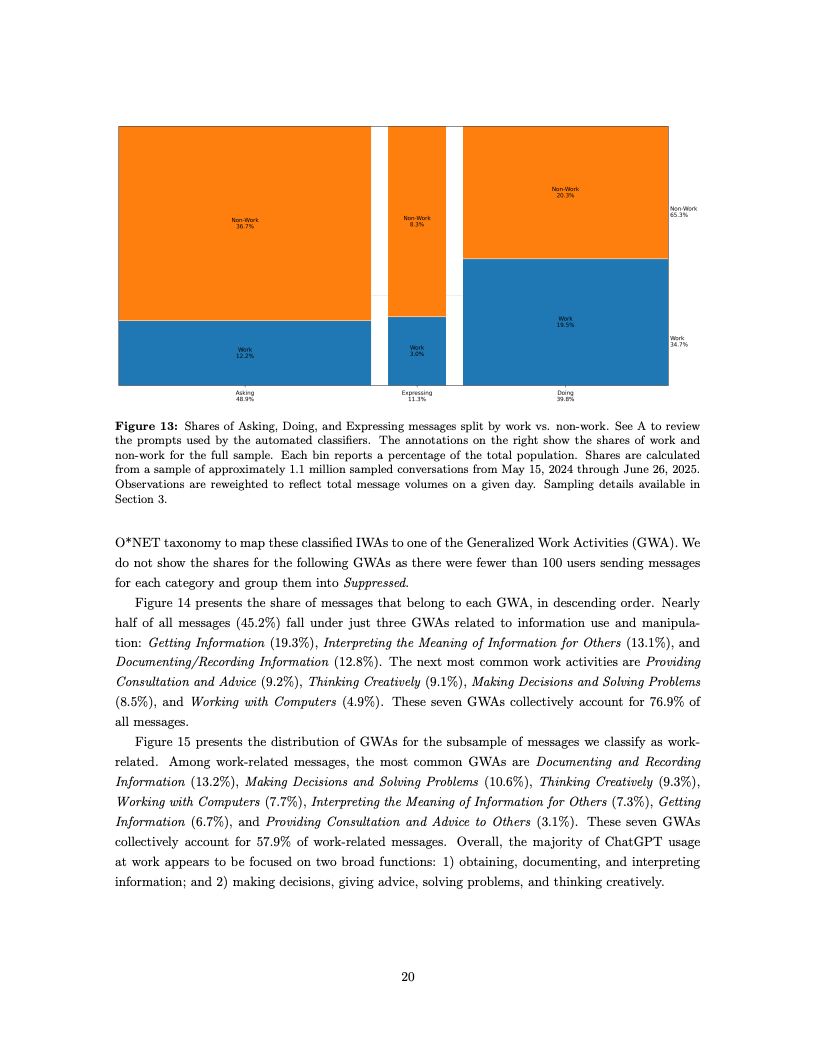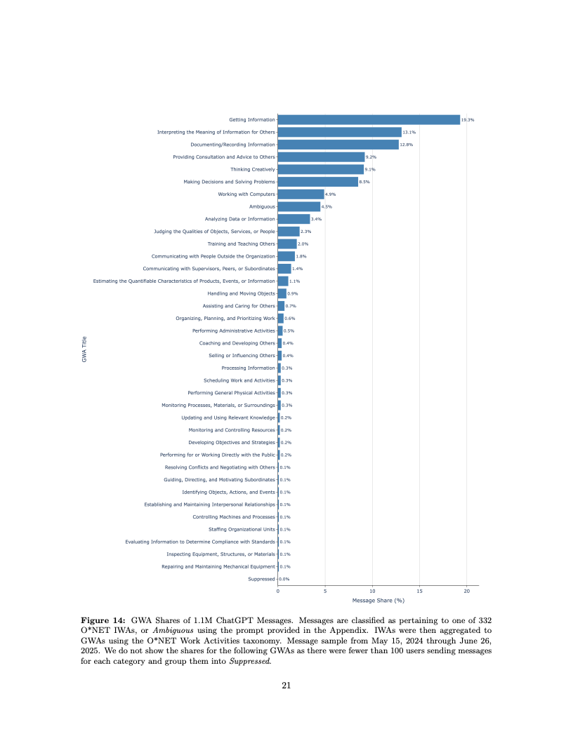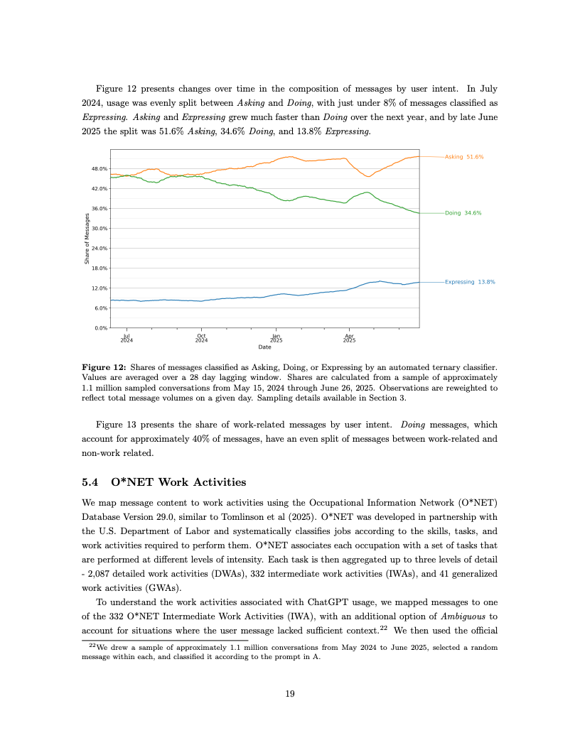 按用户意图分类,49%为询问(寻求信息或建议),40%为执行(生成输出),11%为表达。询问增长最快,到2025年6月占比51.6%。在工作中,执行占比56%,其中写作占35%。O*NET分析显示,工作消息中58%涉及信息获取、记录、解读及决策解决问题,这些在各职业中相似。