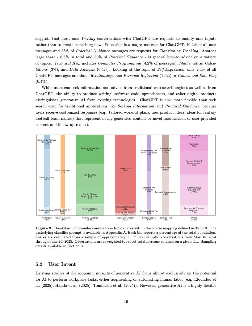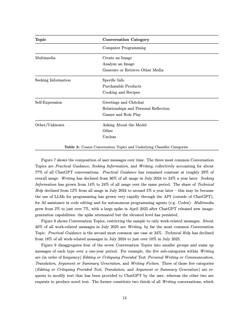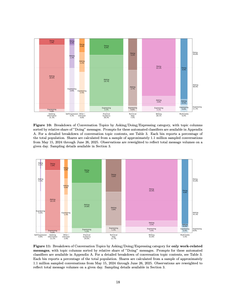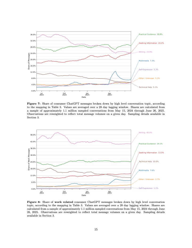 三大对话主题主导使用:实用指导、信息寻求和写作,合计占77%。实用指导包括教程和创意构想,占比29%;信息寻求从14%升至24%;写作从36%降至24%,但在工作中占比40%。编程仅占4.2%,关系与个人反思占1.9%,远低于预期。