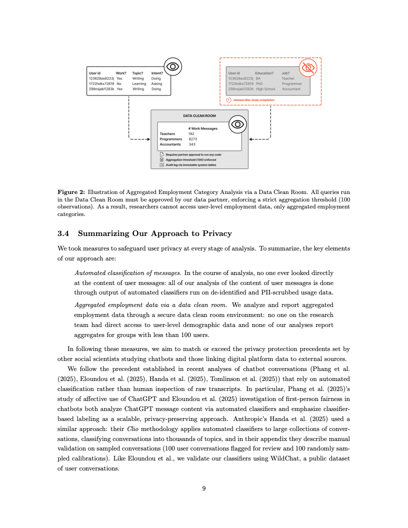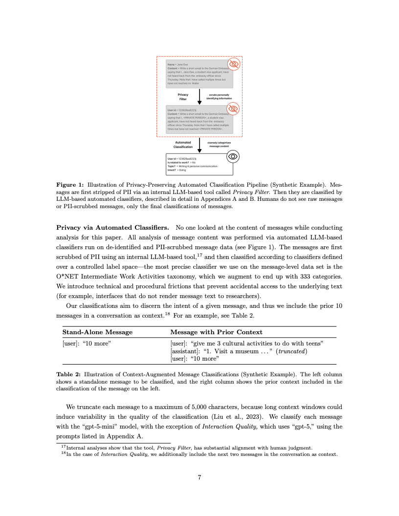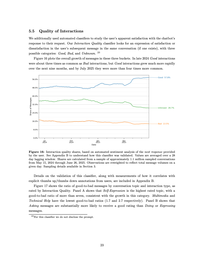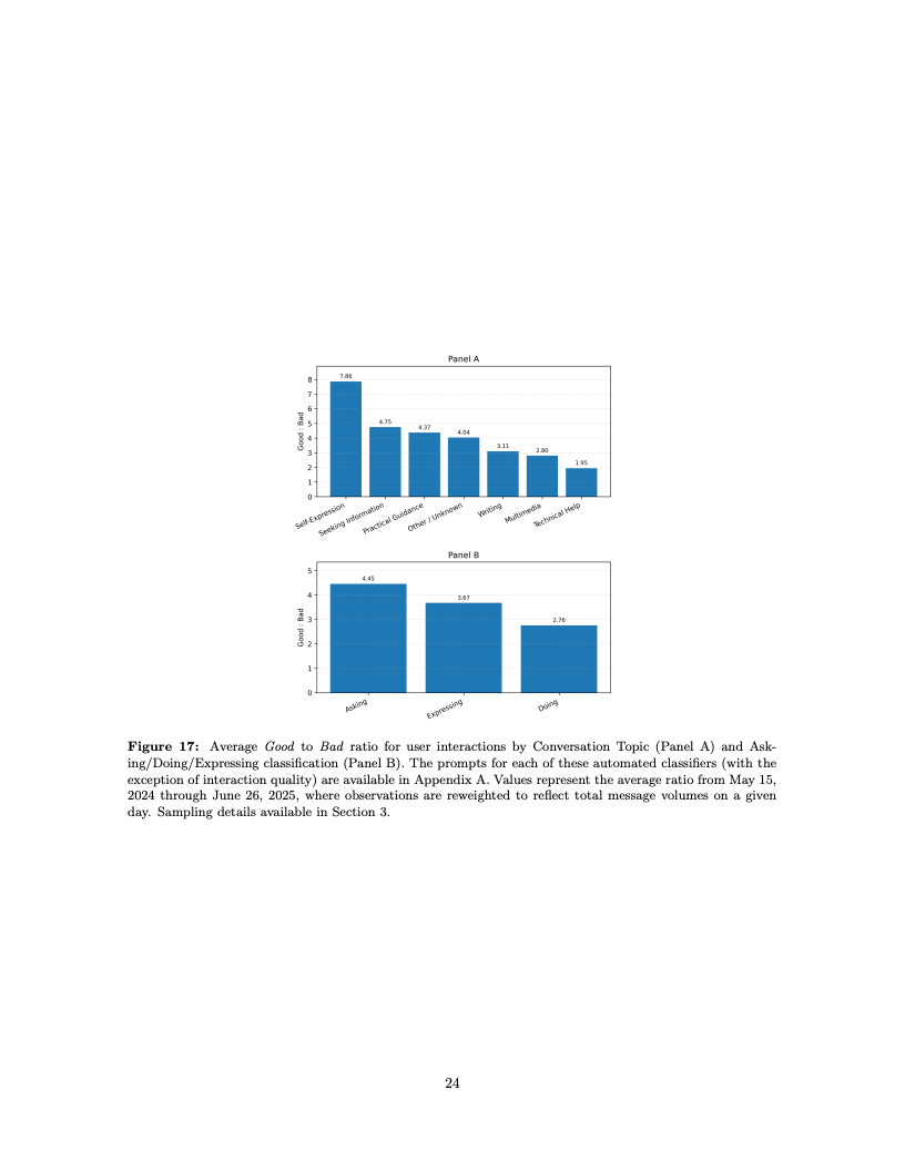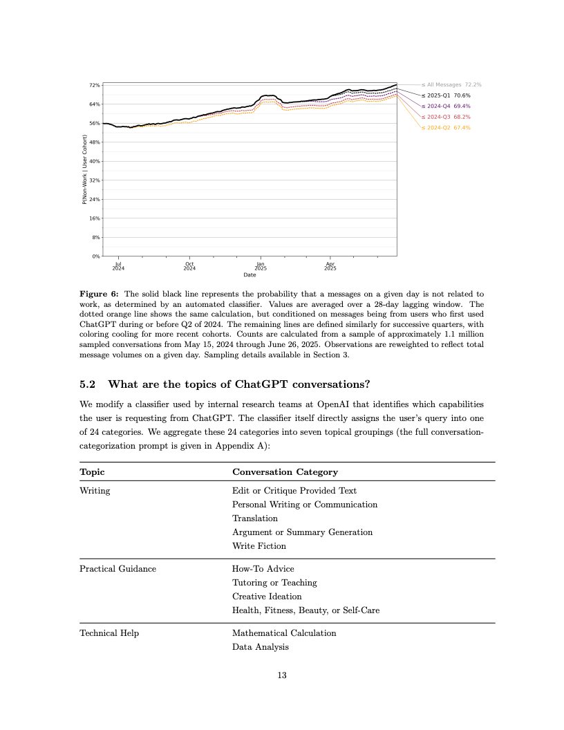 三大对话主题主导使用:实用指导、信息寻求和写作,合计占77%。实用指导包括教程和创意构想,占比29%;信息寻求从14%升至24%;写作从36%降至24%,但在工作中占比40%。编程仅占4.2%,关系与个人反思占1.9%,远低于预期。