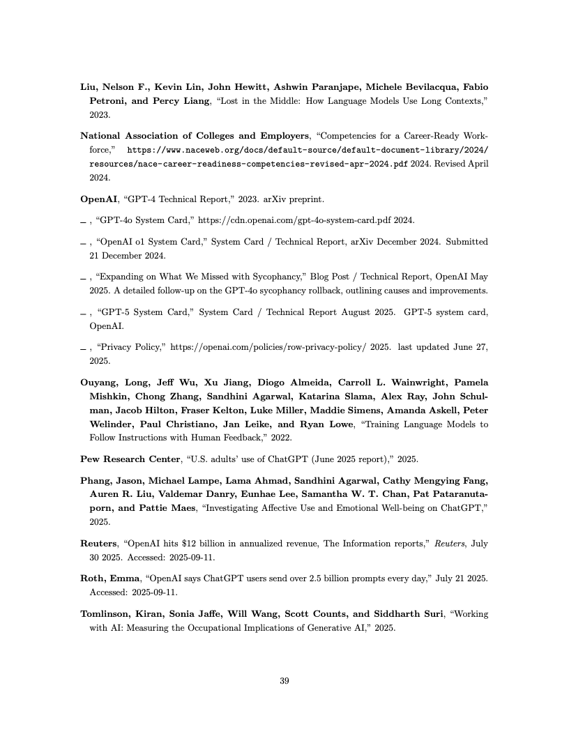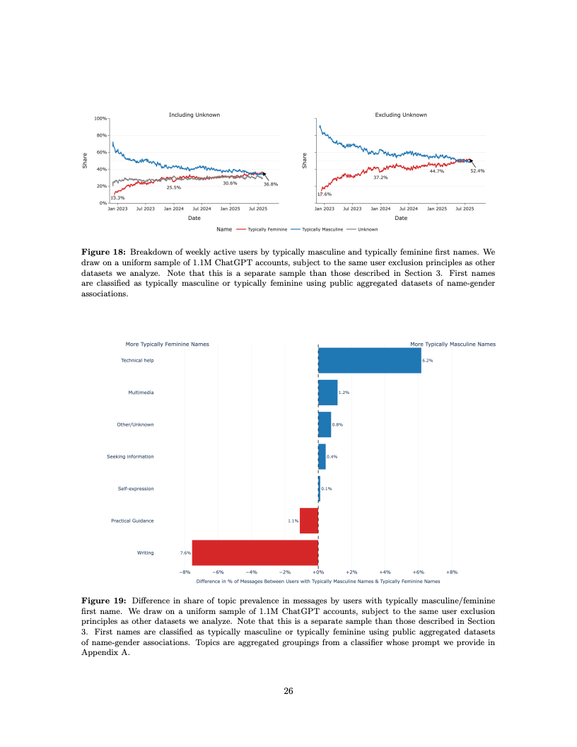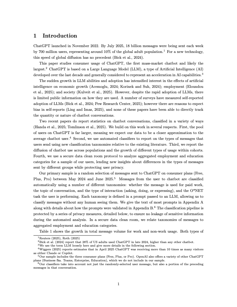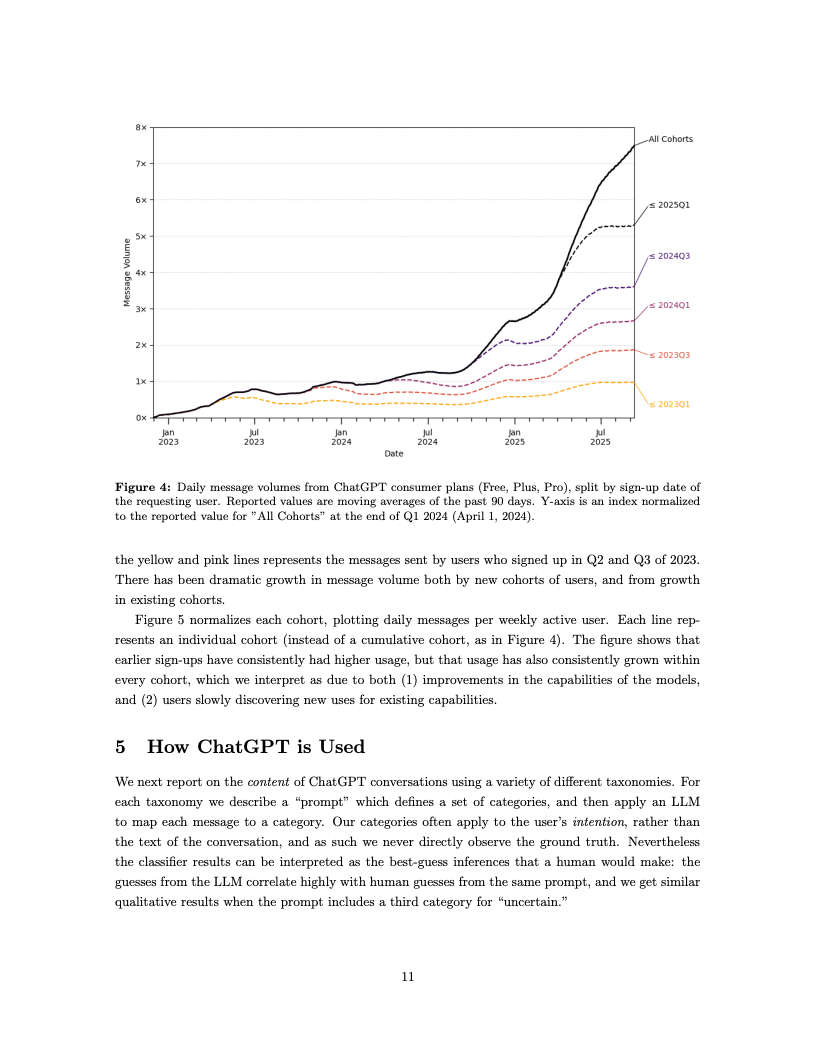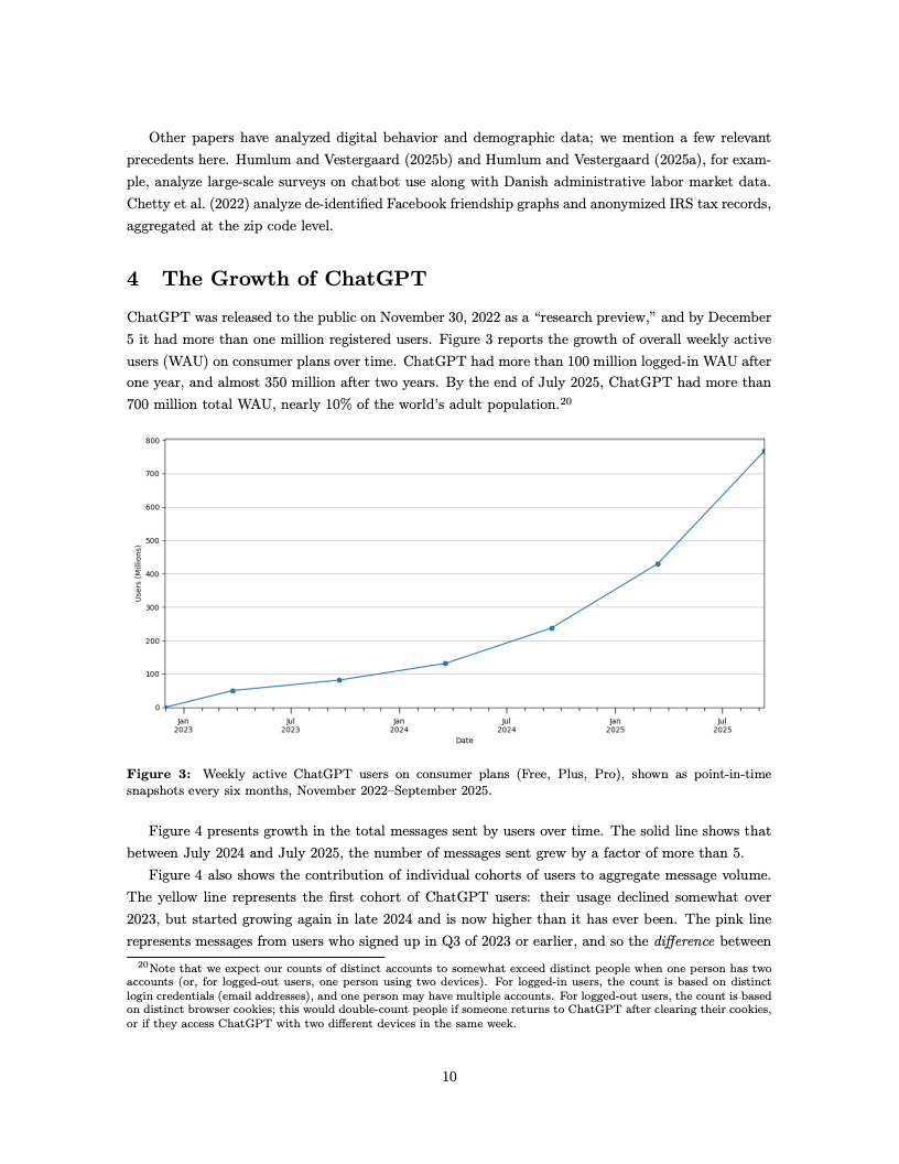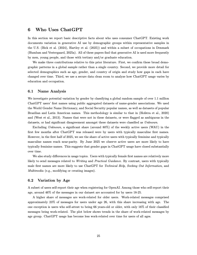 ChatGPT自2022年11月推出以来,已迅速融入全球生活。到2025年7月,其周活跃用户超过7亿,相当于全球成人人口的10%。这一扩散速度史无前例,早于任何新技术。早期用户以男性为主,占活跃用户的80%,但到2025年6月,女性用户比例升至52%,性别差距显著缩小。年轻用户占比突出,18至25岁群体贡献了46%的消息,而年龄越大,工作相关使用比例越高,除66岁以上例外。