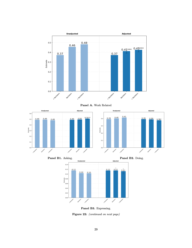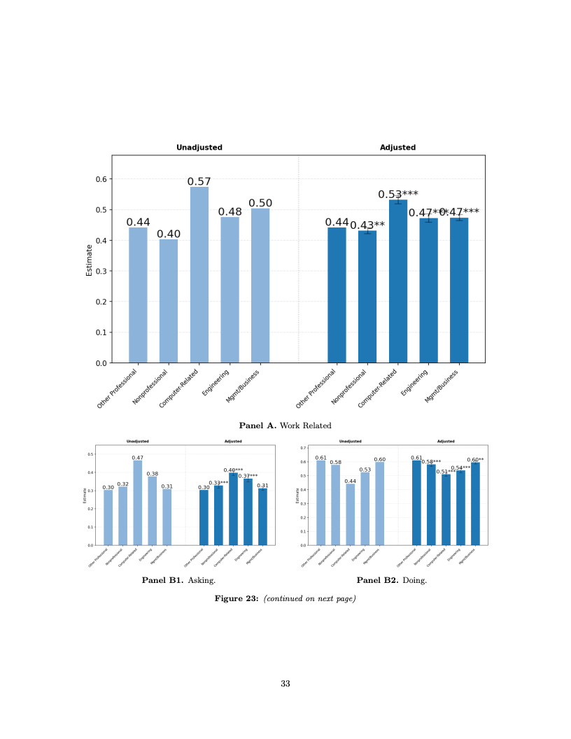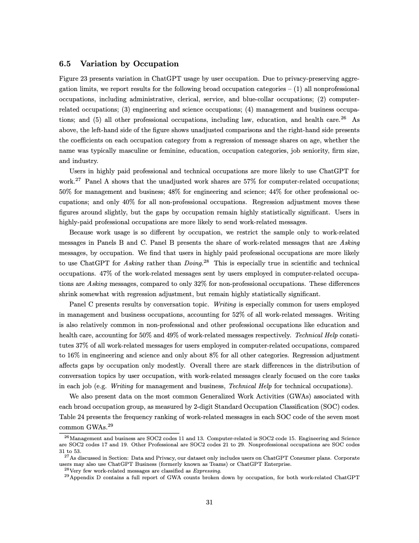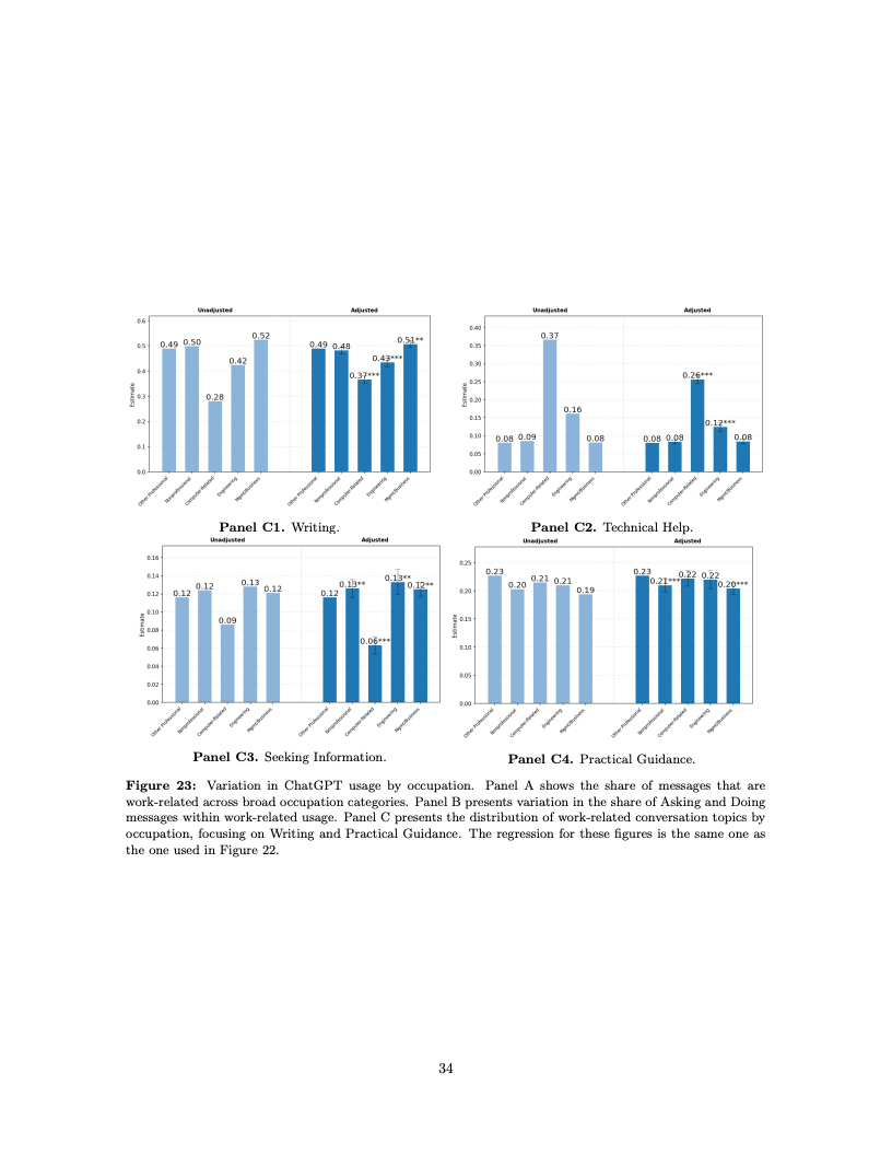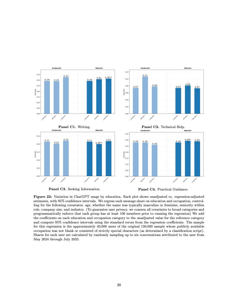 教育和职业影响使用模式。高学历用户工作相关消息占比48%,高于低学历的37%。专业职业如管理和计算机领域,工作使用率达50%以上,且更倾向询问而非执行。写作在管理职业中占52%,技术帮助在计算机职业中占37%。