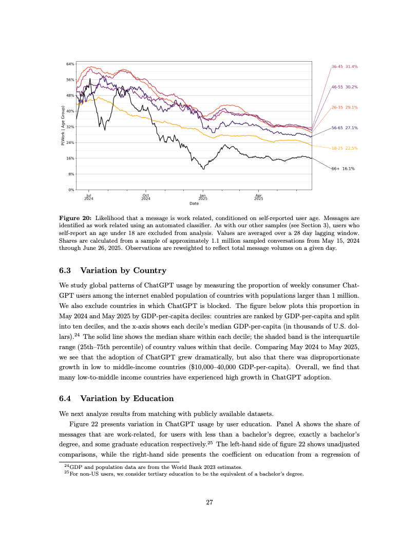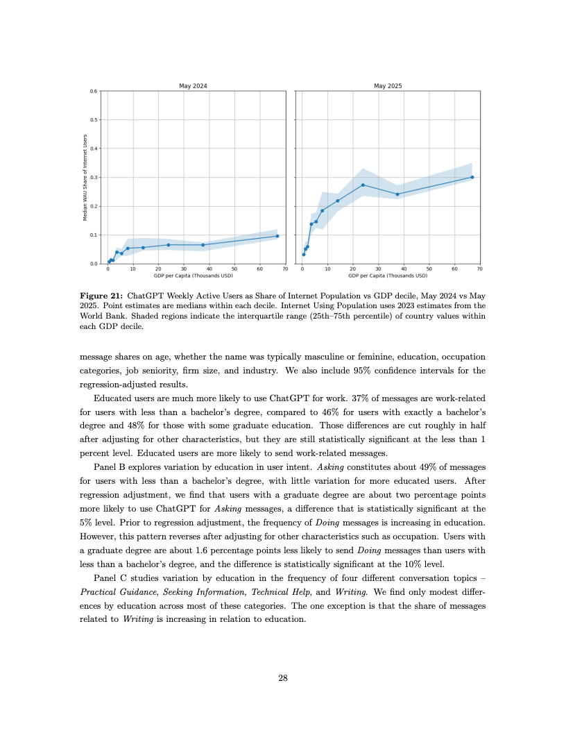 使用增长强劲,从2024年6月的每日4.51亿条消息,到2025年6月的26.27亿条。非工作相关消息占比从53%升至73%,增长速度超过工作消息。这表明AI的影响不止于职场,还扩展到家庭生产。低收入国家采用率增长更快,中低收入国家(人均GDP 1万至4万美元)的渗透率在2024年至2025年间大幅提升。