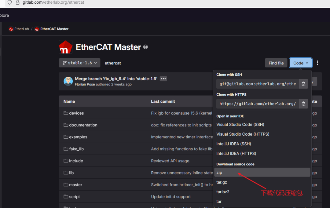 下载的代码压缩包为ethercat-stable-1.6.xxxx,根据压缩包文件类型,将其解压得到ethercat igh的源代码。