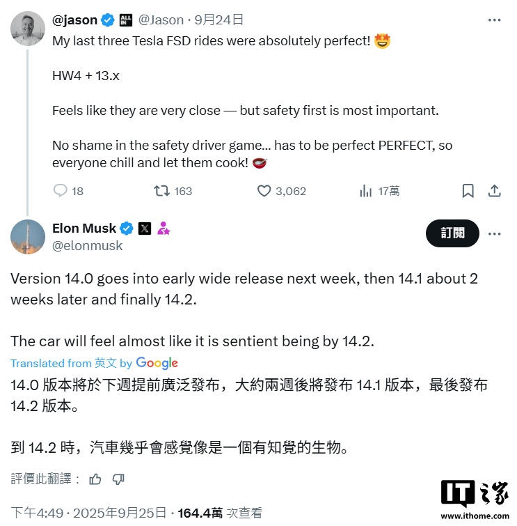 IT之家 9 月 26 日消息,特斯拉 CEO 埃隆・马斯克在 X 平台证实,FSD V14.0 将在下周推送,相比原定的时间晚一个月
