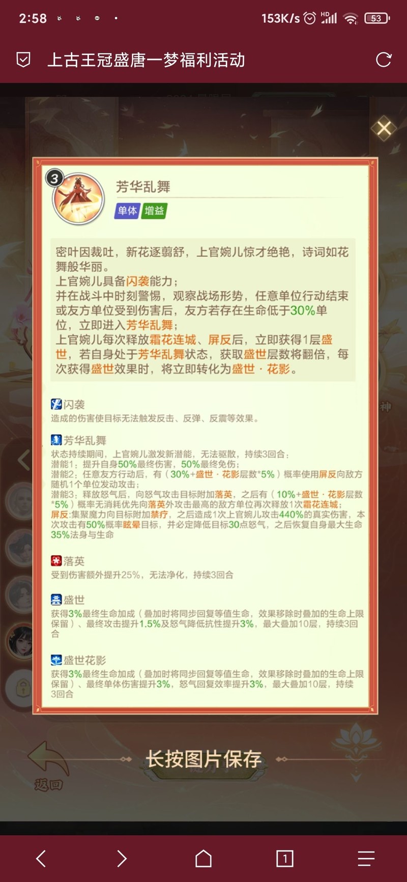 全体队友最终减伤、抗爆和反伤各提升25%,盛世队友效果翻倍,若婉儿达12星,盛世队友的增益效果提升至100%。
