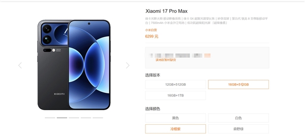 当前小米商城显示,小米17 Pro Max部分版本已经售罄,市场供不应求。