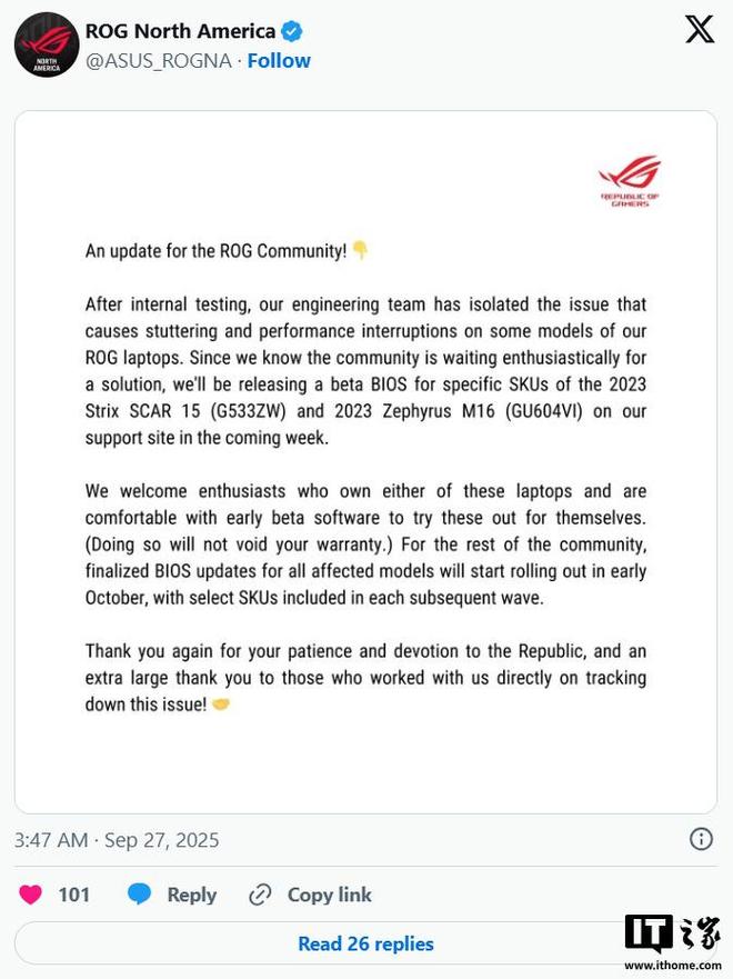 9 月 28 日消息,华硕已于近日启动针对旗下 ROG 系列笔记本电脑广泛存在的系统卡顿和性能下降问题的 BIOS 测试版更新。该公司于 9 月 27 日通过 X 平台(原 Twitter)确认,已查明该问题的根本原因,并将于 10 月初起陆续发布正式版固件修复。