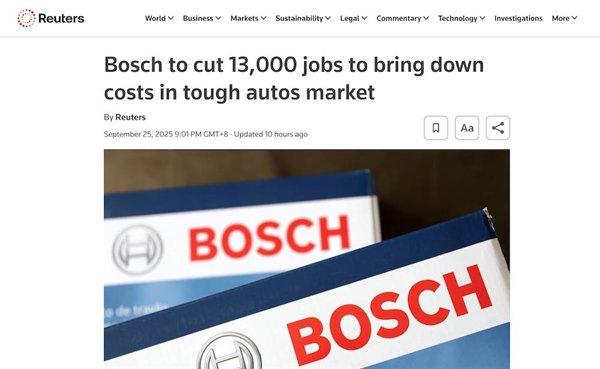 路透社最新爆料,博世计划未来5年进行大规模裁员,人数占公司全球员工总数的3%,高达1.3万人,主要集中在其德国移动出行部门(Mobility),也就是原先的汽车零部件业务部门。