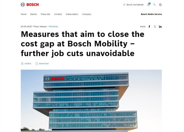其实早在 9 月初,博世就已释放 “预警信号”,当时博世透露,核心的移动出行部门已陷入 25 亿欧元(约合 29.5 亿美元)的成本缺口。