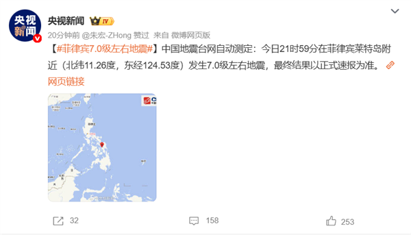 快科技9月30日消息,据央视新闻报道,中国地震台网正式测定:今日21时59分在菲律宾群岛地区(北纬11.20度,东经124.10度)发生6.9级地震,震源深度10千米。