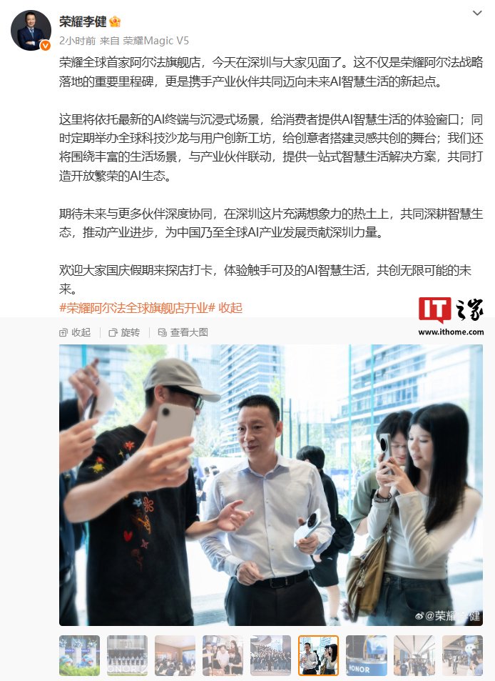 IT之家注意到,荣耀终端股份有限公司 CEO 李健今日发文介绍,荣耀全球首家阿尔法旗舰店不仅是荣耀阿尔法战略落地的重要里程碑,更是携手产业伙伴共同迈向未来 AI 智慧生活的新起点。
