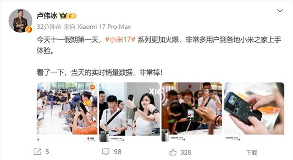 十一假期小米17系列更火爆!卢伟冰:销量非常棒