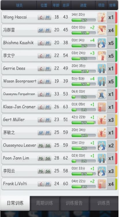 不过,卡周训并不会直接点击它,而是打开大面板,也就是绿色长条上方、通常进入训练界面的区域。打开后可看到每位球员的训练进度情况。所示,在项目与进度之间的+1,即为此次训练所获得的属性增加值。