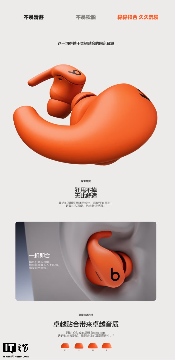 据官方介绍,这是一款“无惧高强度运动”的真入耳式耳机,其耳翼采用柔韧贴合式设计,适配所有耳形,只需要轻柔放入耳廓即可固定,随附 4 种大小的耳塞,用户可通过 iOS 或安卓版 Beats App 对每一种耳塞进行贴合性测试,找出最适合自己的耳塞尺寸。