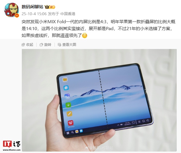 IT之家 10 月 4 日消息,博主 @数码闲聊站 今日发文透露,明年苹果第一款折叠屏的比例大概是 14:10。博主表示,小米 MIX FOLD 一代的内屏比例是 4:3,这两个比例其实蛮接近,展开都是 Pad,不过 21 年的小米选错了方案,如果按虚线折,那就遥遥领先了。