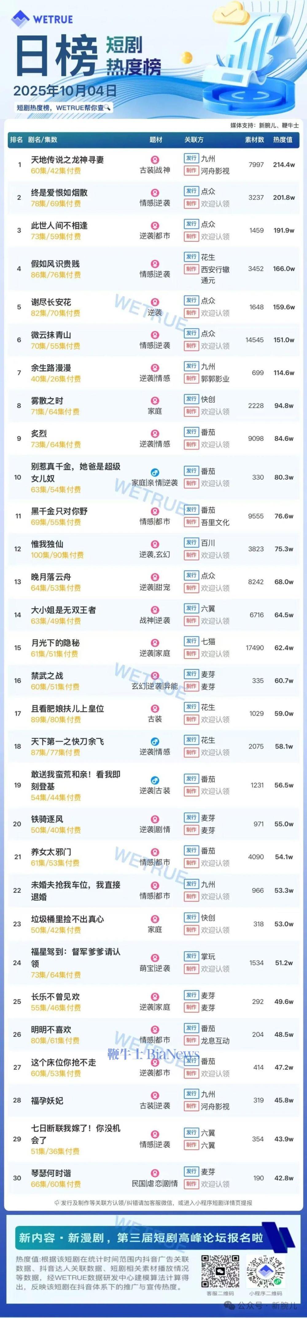 4日短剧热度榜:《天地传说之神龙寻妻》第一,大盘热度4525万