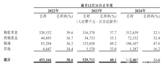 值得一提的是,虽然溜溜果园业绩逐年增长,但其核心业务梅干零食毛利率逐年下滑。招股书显示,2022年至2024年,公司梅干零食营收占比均超六成,其毛利率分别为39.6%、37.7%、32.1%,而平均售价分别为39.4元、38.7元和35.2元,均呈下降趋势,溜溜果园业绩的增长是否具有可持续性还有待商榷。