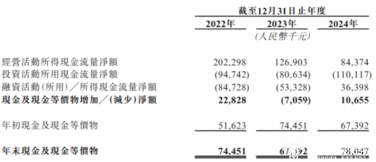 据招股书透露,溜溜果园2022年至2024年负债总额分别为11.43亿元、11.29亿元、10.53亿元,而流动负债净额分别为5.07亿元、2.39亿元和1.13亿元,虽然呈下降趋势,但依然为正值,这也意味着,溜溜果园这三年流动资产不足以覆盖其短期债务,而经营活动所得现金流量净额分别为2.02亿元、1.27亿元、8437.4万元,呈逐年下降的趋势,资金压力较大。