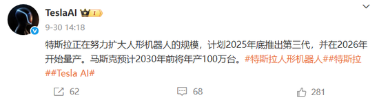 9月30日, “TeslaAI”再发文,特斯拉正在努力扩大人形机器人的规模,计划2025年底推出第三代,并在2026年开始量产。马斯克预计2030年前将年产100万台。