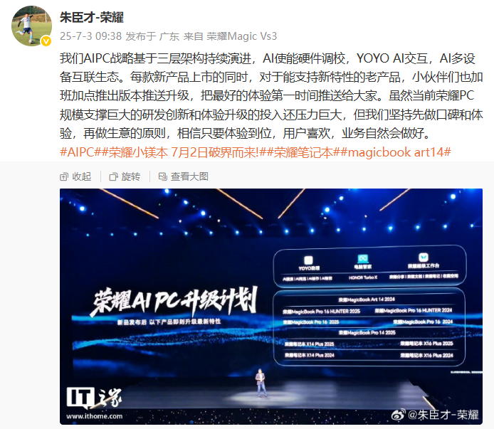 IT之家注意到,朱臣才在今年 7 月发文称,荣耀的 AIPC 战略基于三层架构持续演进,AI 使能硬件调校,YOYO AI 交互,AI 多设备互联生态。每款新产品上市的同时,对于能支持新特性的老产品,也加班加点推出版本推送升级。