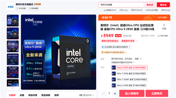 国内市场方面,京东英特尔官方旗舰店Ultra 9 285K盒装到手价3949元,同样是历史最低,相比去年首发价4799元直降了850元。