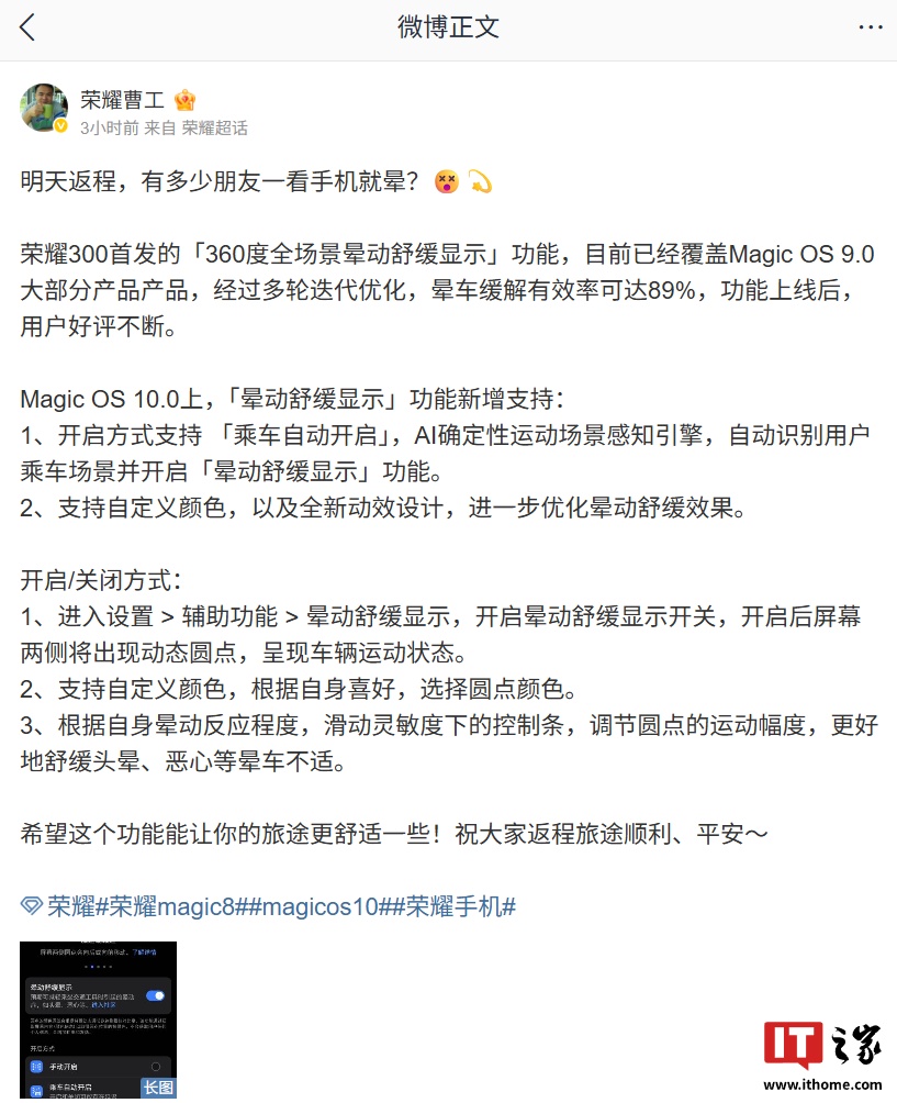 IT之家 10 月 7 日消息,荣耀 Magic 系列旗舰手机系统工程师 @荣耀曹工 今日在微博介绍了 MagicOS 10.0 系统的「晕动舒缓显示」功能。据称,该功能将新增支持如下特性: