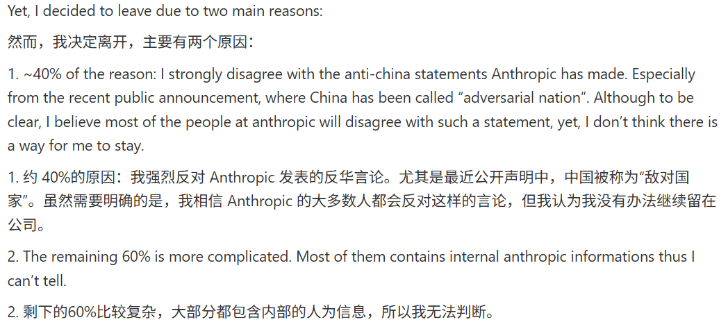 而他此次之所以选择离开 Anthropic,主要有两个方面的原因: