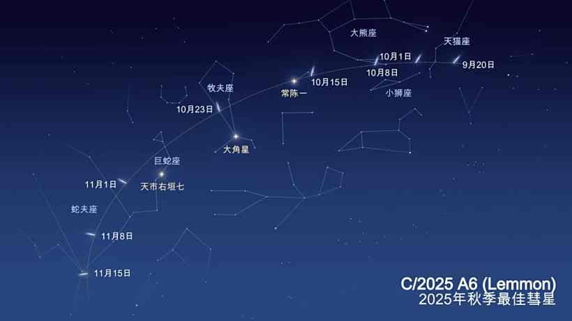 C/2025 A6(莱蒙)目前在北半球的晨空中可见,但到 10 月中旬会转入傍晚天空。高纬度北方地区尤其有利 —— 到那时,它甚至会在北纬 48° 以上成为拱极星。到 10 月底至 11 月初,彗星亮度可能达到 3–4 等,然后很快变暗。大约在 11 月 20 日,它将消失在傍晚的暮光中。