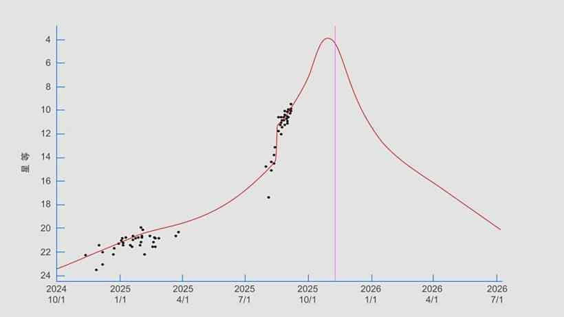 实际上,天文学家最初预测这是一颗相对暗淡的彗星(9 等),然而它在 2025 年 7 月 2 日与太阳合之后,8 月中旬的观测显示彗星活动增强,亮度在一个月内迅速从 16.5 等提升至 9 等。到 9 月时已经超过了预期的峰值亮度,并继续变亮。