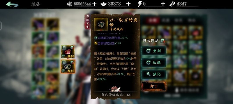 罪业装备可以通过吞噬极品装备来提升等级并增加额外属性。当吞噬的装备为对应部位时,有一定几率获得该装备的效果。每件罪业装备最多可同时拥有两种极品装备效果。若再次获得新的效果,系统将弹出选择界面,左侧为当前已拥有的效果,点击可进行锁定;右侧为新获得的效果,点击即可选择保留哪一个效果。