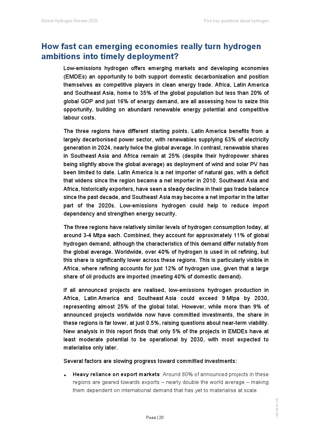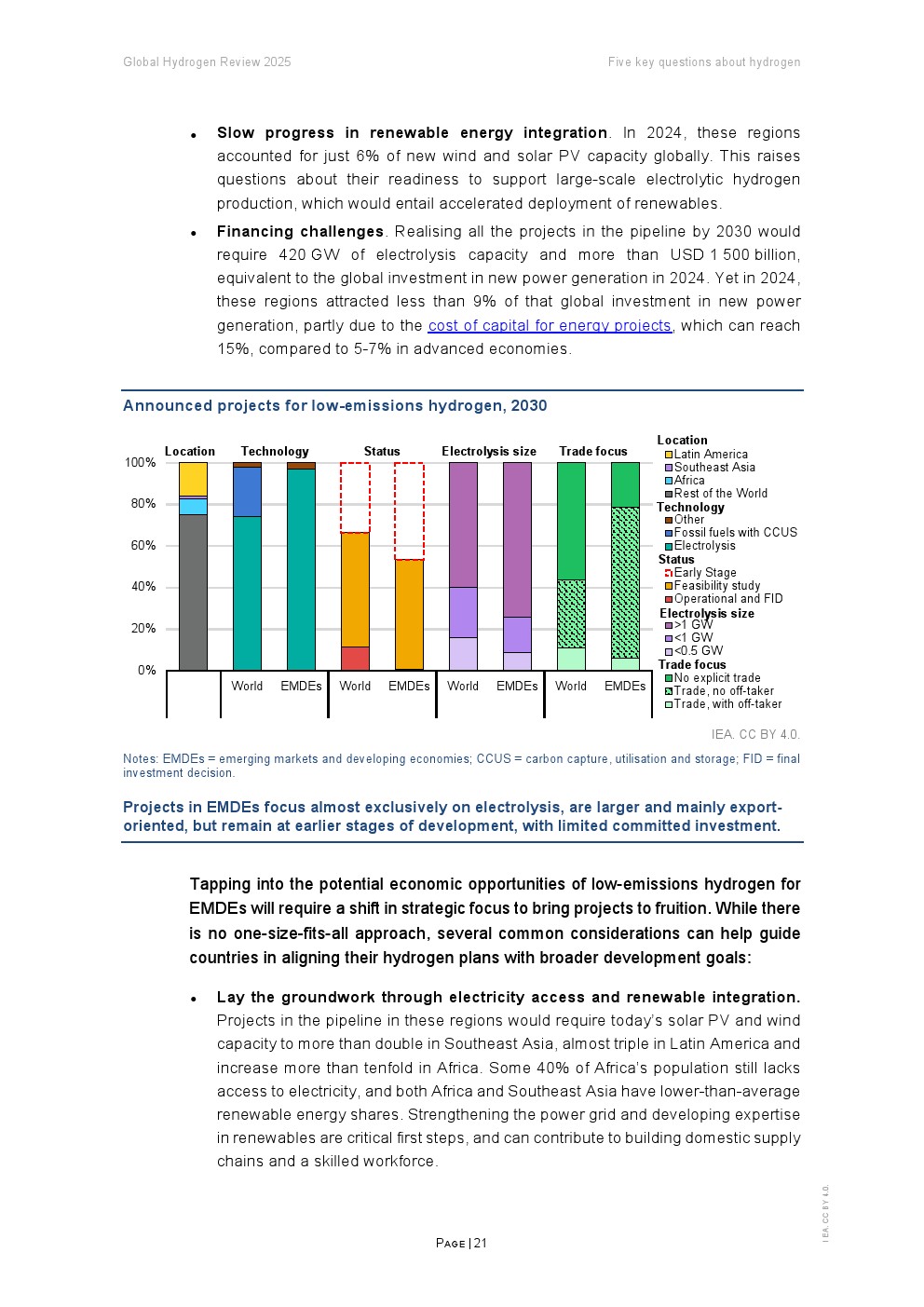 并非所有已公告的项目最终都能实现;因此,实际产能很可能低得多。即便如此,根据这份新报告,到本十年末,低排放氢气产量预计将较当前水平有显著扩张。到2030年,已投入运营、正在建设或已达成最终投资决策的项目,其年产量预计将比2024年水平增长五倍以上,超过400万吨。如果实施有效政策以确保需求,另有600万吨的年产量也极有可能在2030年前投入运营。