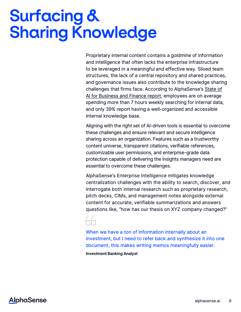 内部知识共享一直是投资机构数字化转型的难点。报告显示,员工平均每周花费七小时寻找内部数据,且仅39%的企业拥有组织化、可访问的知识库。借助AI驱动的内容管理和智能检索系统(例如AlphaSense的企业智能模块),可打破数据孤岛,实现权限定制、内容可信标注与端到端数据保护,把分散的调研、备忘录、内部分析整合到统一框架下,极大提升知识的流动效率和安全性。